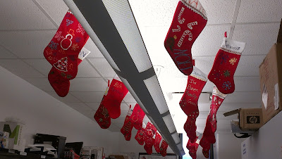 Something equally as fun and a lot less silly. Every person who is in the lab is required to make a stocking and decorate it! The decorations are holiday season themed and every year we hang up the stockings of everyone who has ever gone through the lab and everyone in the lab. As stockings went up, our PI recounted various experiences she had with the former labbies and explained to us what they were doing now. And since this was my first year... I decorated my stocking!